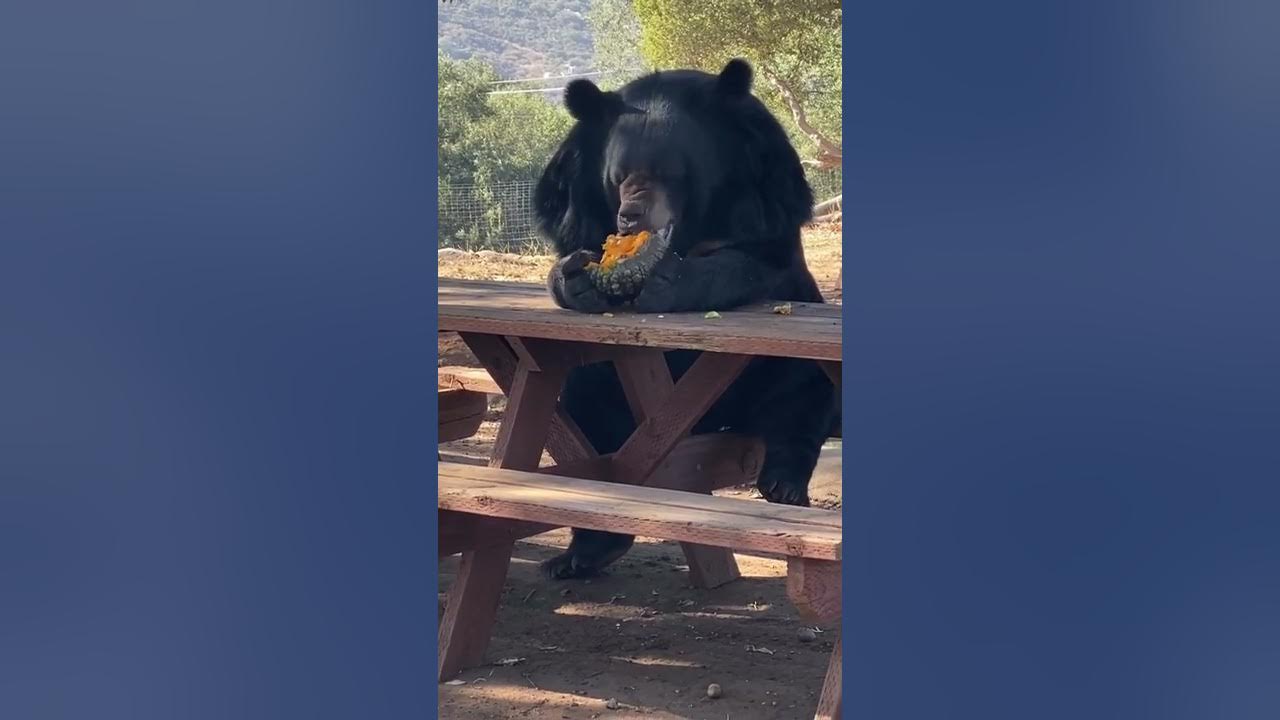 Bear Sits At Picnic Table Like Human To Eat Gourd